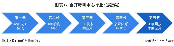 1956年美国泛美航空公司建成了世界上第一家呼叫中心,在20世纪80年代,呼叫中心在欧美等发达国家的电信企业、航空公司、商业银行等领域得到了广泛的应用。第一代呼叫中心的系统既有PBX的功能,也有电话排队功能,那时主要称为热线电话,其全部服务由人工完成。第二代呼叫中心在呼叫中心中利用IVR (Interactive Voice Responce,交互式语音应答)系统,其可以将大部分常见问题交由系统设备通过语音播放、DTMF(双音多频,电话机上面的数字按键所发出的频率)按键交互解决。第三代呼叫中心是CTI (Computer Telephony Integration,计算机电话集成)技术的应用,CTI技术实现了电话交换机系统与计算机系统的集成,即实现了语音与数据的同步。客户信息与资料采用数据库方式存储,座席代表可以在处理电话服务的同时可以从计算机系统中调取和修改客户信息数据,为客户提供个性化的服务。第四代呼叫中心也称为多媒体呼叫中心或联络中心(Contact Center),它相对传统呼叫中心来说接入渠道丰富,同时引入了多渠道接入与多渠道统一排队等概念。第五代呼叫中心是在第四代多媒体呼叫中心的基础上,更多地融入了依托于互联网技术的媒体渠道与沟通渠道。例如:社交网络、社交媒体(如微博、微信等媒体渠道),依托于互联网的文本交谈、网上音频、网上视频等沟通渠道。