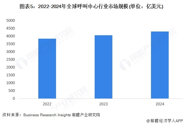 Business Research Insights数据显示,呼叫中心市场规模从2022年的3843亿美元增长至2024年的4302亿美元,年复合增速5.8%。全球呼叫中心将从大行业渗透到小行业,并从单一功能升级到多功能,利用VOIP技术和人工智能技术,实现从成本型到利润型的转型。